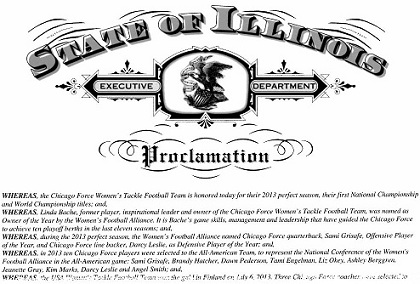 Bitter cold and extreme snowy conditions weren’t going to dampen the spirits or keep the Chicago Force family away from a long awaited opportunity to receive their 2013 Championship Rings. A capacity crowd of players, coaches, staff, and their families, filled the banquet room at Leona’s pizzeria in Chicago’s Wicker Park neighborhood on Sunday January 5. City and state political dignitaries were also on hand to recognize the team for a perfect 12-0 season record. Mica Matsoff from Illinois Governor Pat Quinn’s office presented team owner Linda Bache with a state proclamation. Robert Fioretti, second ward Alderman from the City of Chicago represented Mayor Rahm Emmanuel and the entire city council and designated January 5, 2014 as Chicago Force Football Team Day. A similar proclamation was also presented from Cook County Board President Toni Preckwinkle’s office. "This was such a wonderful surprise for the team," Bache said, "to be acknowledged in this way by our city, county and state is incredibly gratifying. We're especially grateful to Alderman Fioretti and Mica Matsoff for personally presenting us with these honors on a day when most people refused to leave their homes. It made for a very special day." As everyone enjoyed ‘Chicago’ style pizza, a video presentation allowed many to relive the title game played in San Diego and the locker room celebration after the dismantling of the Dallas Diamonds 81-34. Then the moment of truth as the rings were presented. Linda remarked that she had never seen so many people staring at their hands which drew loud laughter from everyone. Many hugs, tears, and photos followed and no one seemed to feel the cold as they headed out the door from a great event. Click Here to see the pictures from the rewarding event. To see the State of Illinois Proclamation, click HERE: